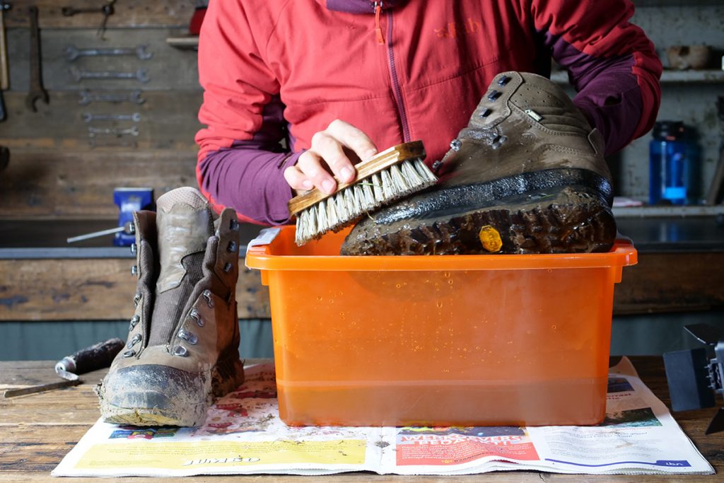 - Xả nước vào bên trong giày để rửa sạch dung dịch xà phòng.