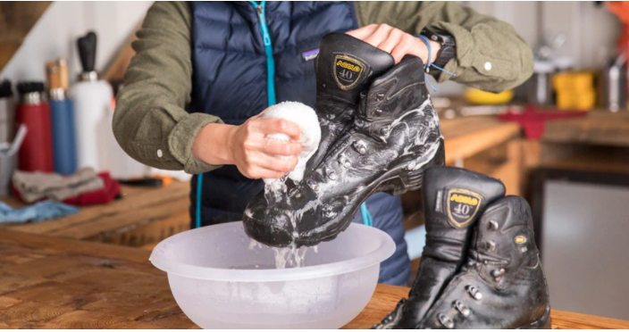 - Sau đó, hãy vệ sinh bên ngoài giày bảo hộ lao động mũi thép. Sử dụng vải sạch và dung dịch nước xà phòng để làm sạch bên ngoài giày. Di chuyển các ngón tay của bạn theo chuyển động tròn nhẹ nhàng trong khi làm sạch các phần da.