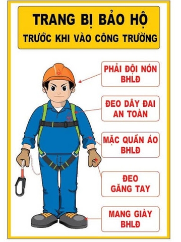 Công nhân xây dựng: Bắt buộc phải có quần áo bảo hộ, giầy (ủng ) bảo hộ, áo phản quang, mũ bảo hộ, khẩu trang, găng tay bảo hộ,...